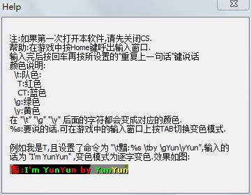 | -- 作者:muzi_Angel -- 发布时间:2013-08-07 7:42:00 -- 【申精】Dreary彩色字打字器 【Dreary-彩字打字器】下载地址: 点击浏览该文件具体贴图: 解压后界面: 此主题相关图片如下:![]() 选择反恐精英可执行文件: 此主题相关图片如下:![]() 选择好确定,设置预设文字(可留空),【其中,“%s”后是说的话,不能删除】,这是我的设置: 此主题相关图片如下:![]() 4L还有!