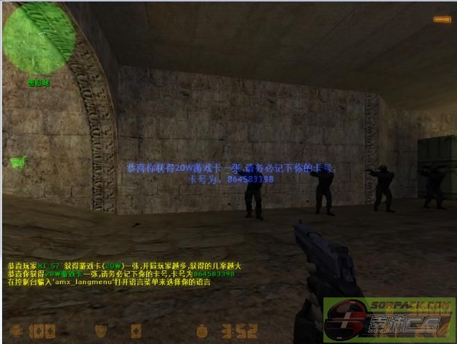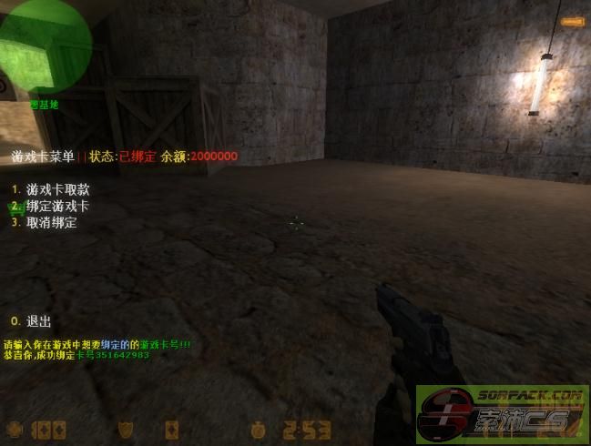 在CS目录的cstrike\\addons\\amxmodx\\configs\\cards.ini中可以手动添加游戏卡,若想可以自动添加的请购买正式版本 卡号的大小必须小于2147483647,否则将会显示错误 游戏中按y输入cardmenu打开游戏卡菜单 [此贴子已经被作者于2014-10-6 13:13:43编辑过]