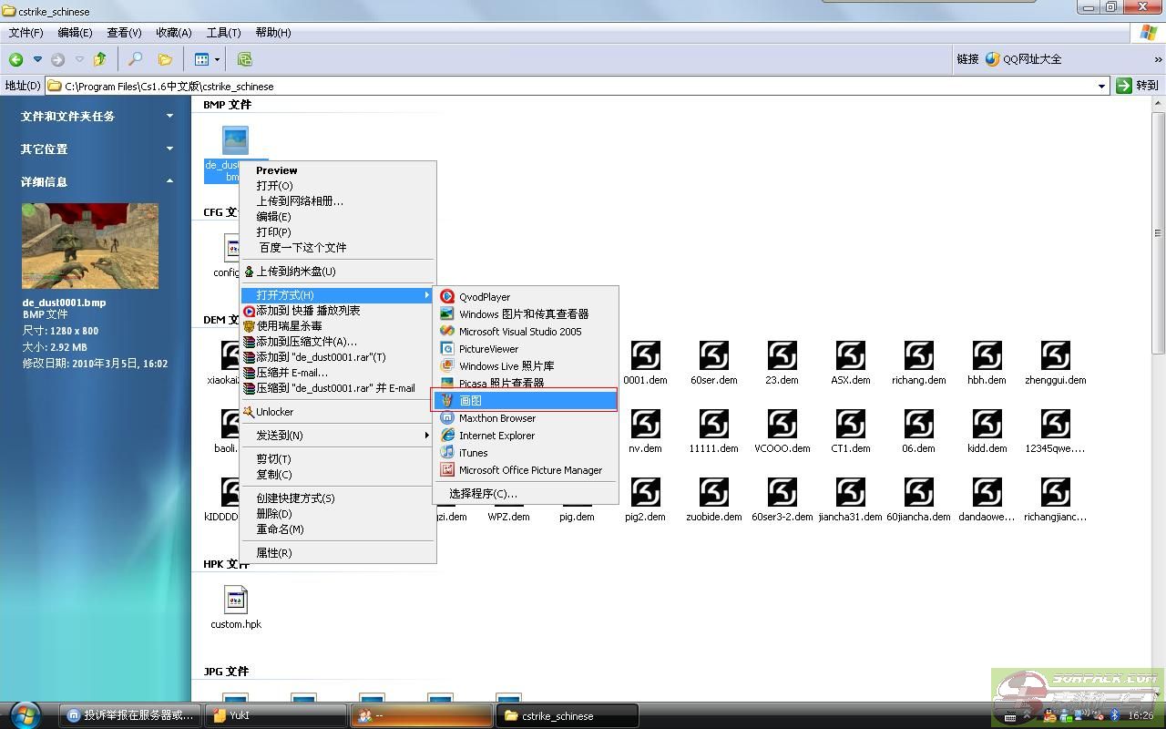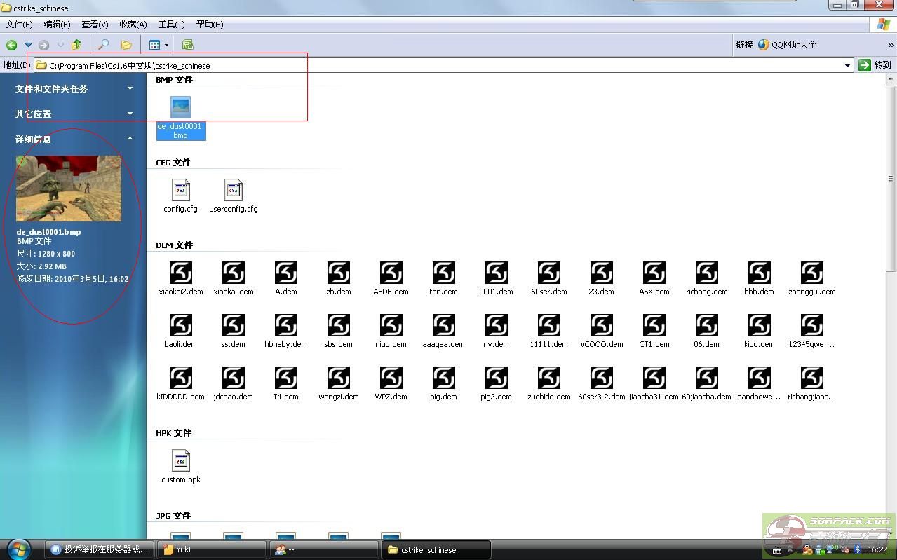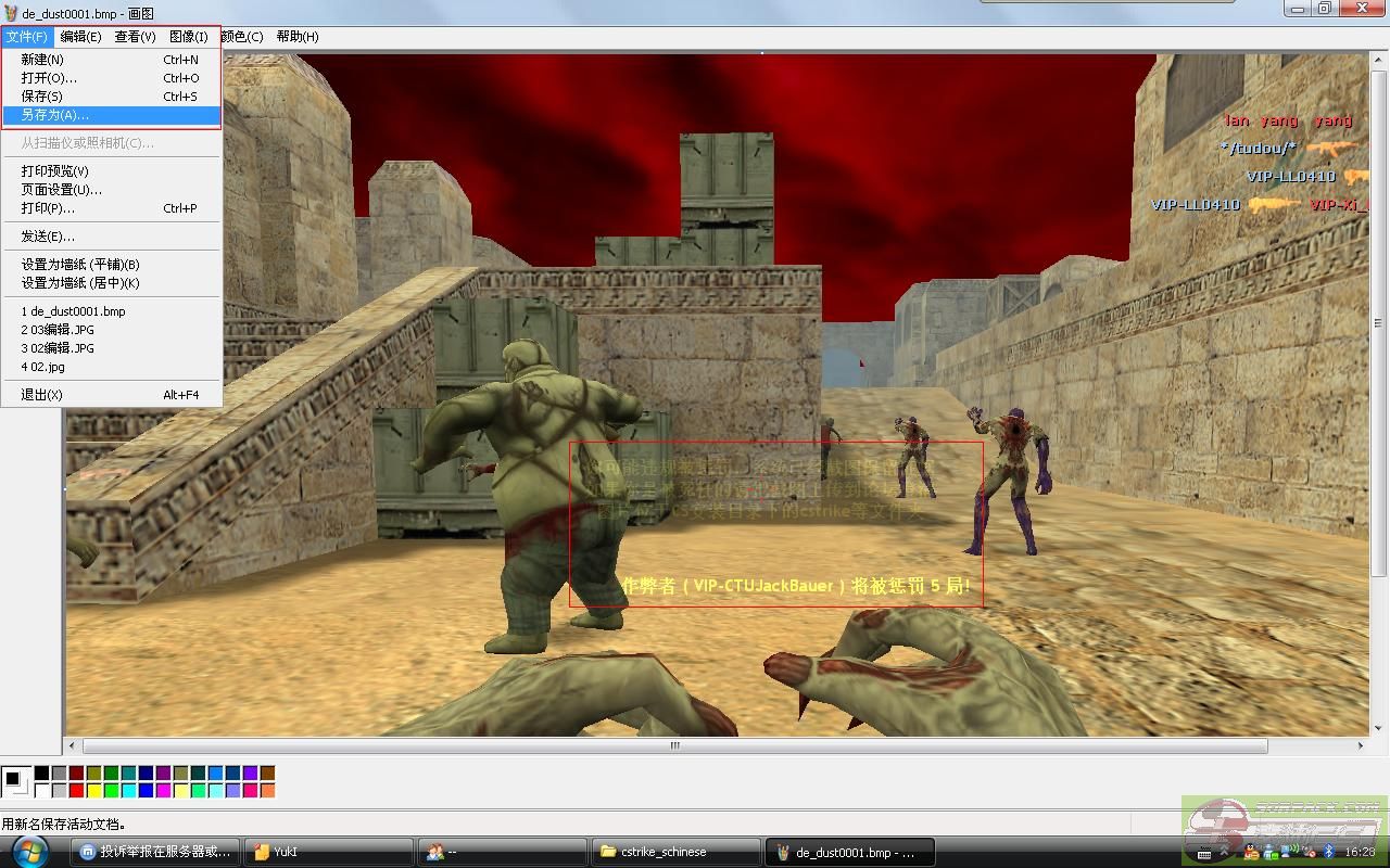 | -- 作者:CTUJackBauer -- 发布时间:2010-03-05 17:10:00 -- 一:被OP后如何提供系统自动截图证明自己清白:(图片均可以点击放大)1.每次投诉后,版主总会要求上传系统截图,这个截图的位置在哪里呢? 在你的CS安装目录下的一个叫做cstrike_schinese的文件夹中(繁体中文版和英文版与简体中文版略有不同) 2.找到那个系统截图了,是bmp格式的。左边会有提示,这张图的日期、格式等 3.以bmp格式是无法上传到论坛的,你上传完只会出现一个红X。所以我们要转换格式。 右键单击这张bmp格式的系统截图,在打开方式中选择画图。这样这张图就在画图程序中被打开了 4.在画图程序中确认是这张图,一般都有中间的黄字,但不排除因为延迟造成没有黄字。然后左键单击另存为 5.在另存为对话框中选好保存路径,注意这里的保存类型。现在是bmp,点击黑色下箭头,选择JPEG那一项。保存 6.好了,保存完了。通过属性比较我们可以发现,jpg之所以可以上传是由于他比bmp小很多 此主题相关图片如下:![]() [此贴子已经被作者于2010-3-5 17:18:03编辑过]