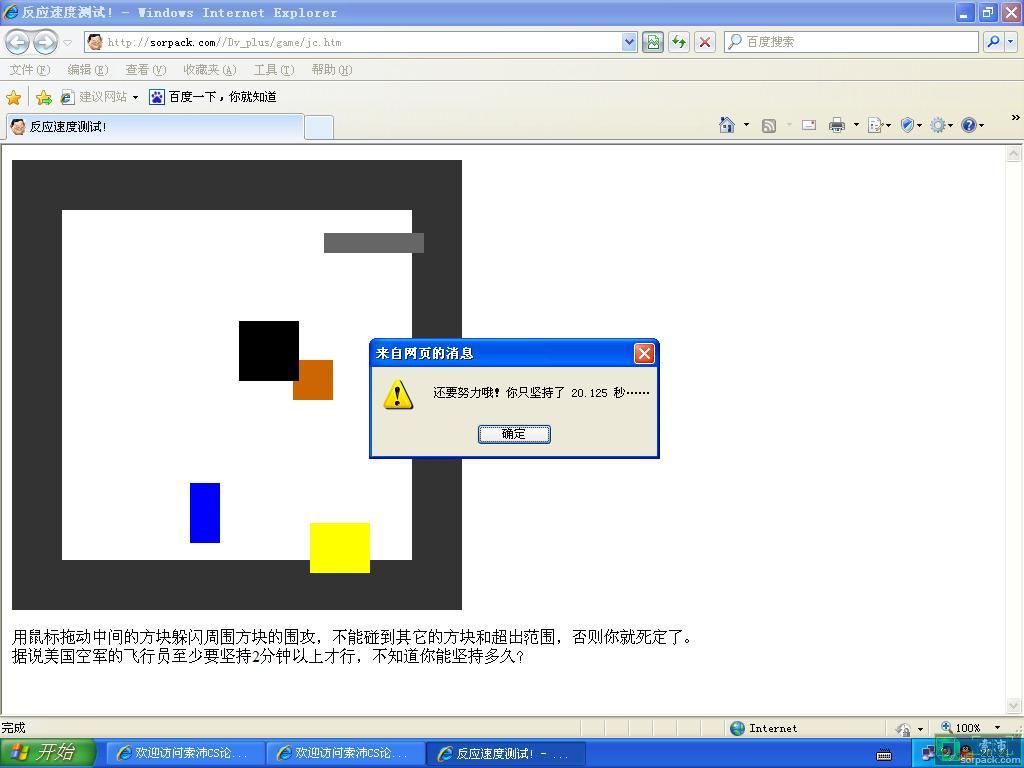 | -- 作者:happyJohn -- 发布时间:2010-01-25 19:52:00 -- 反應速度測試 雖然好像不關我們版事,但為了人氣也要的 http://www.sorpack.com/Dv_plus/game/jc.htm 凡是可以過到20秒的就50索沛幣,30秒就100索沛幣 破記錄的就150索沛幣 此主题相关图片如下:![]() ps:每人每天只限一次 [此贴子已经被作者于2010-1-25 20:12:11编辑过]