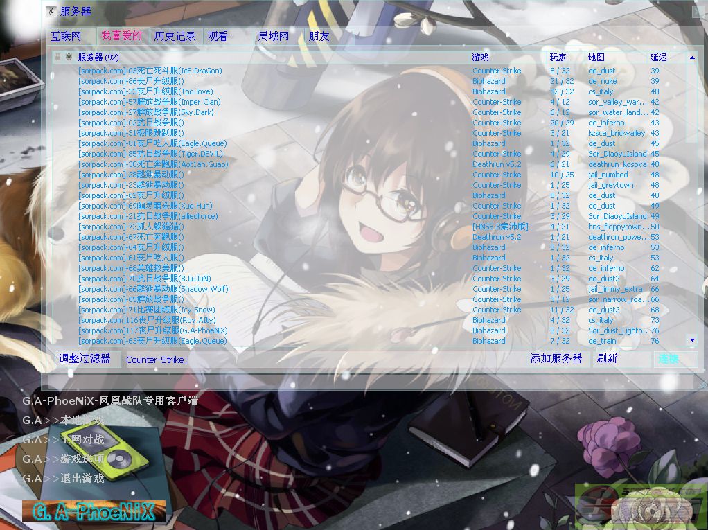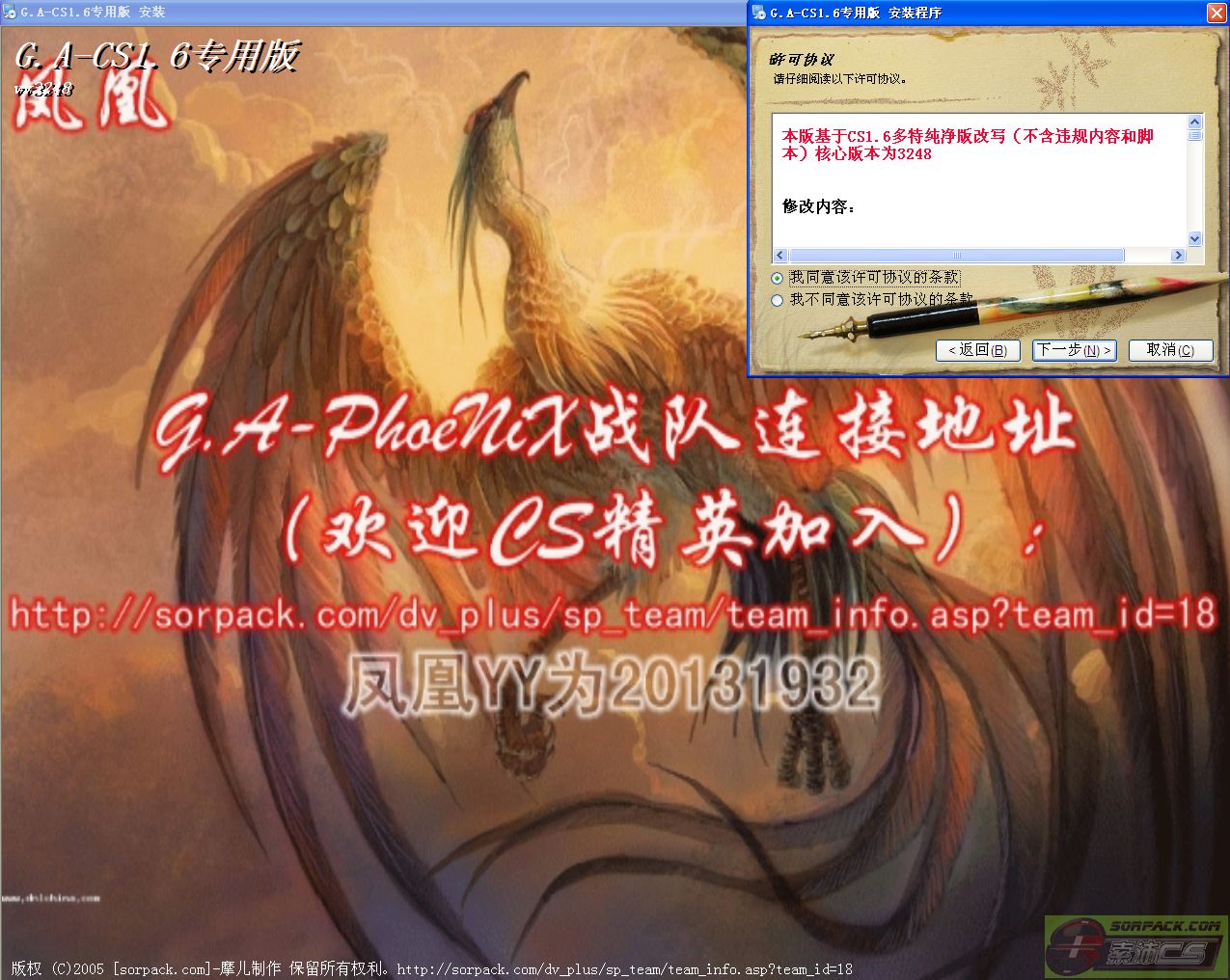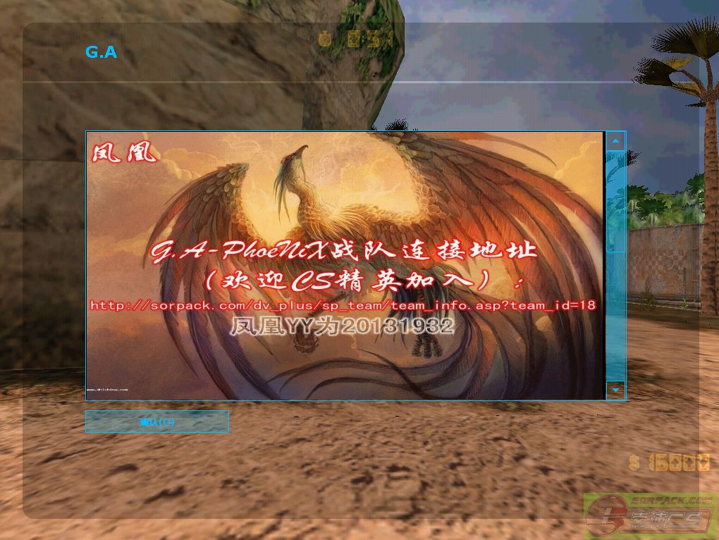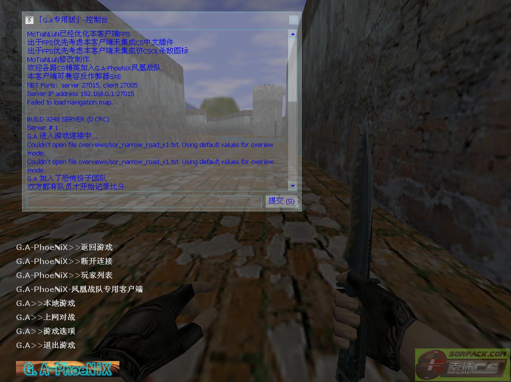 | -- 作者:MoTiaNLuN -- 发布时间:2013-04-26 18:47:00 -- [已更新]【完全兼容SXE】G.A-PhoeNiX【凤凰】专用客户端v3248 先声明下:均属本人原创,无任何复制或盗用他人成果(也没有盗用迪迪的成果),也没问其他人技术问题,都是我自己没事专研的- - [已更新]完全兼容SXE反作弊器,更新CS主题和media,删减部分内容 开启SXE后截图[NO SXE已消失] 电脑不是很好,却又想边玩边听音乐的可以用我这个版本(不需要额外打开音乐播放软件的)专题连接地址:http://bbs.sorpack.com:81/dispbbs.asp?BoardID=52&replyID=631165&id=1148559&skin=0 不喜勿喷-谢谢各位支持 2L附上本人的杀毒日志(建议下载后杀毒在使用) 2L附上本人的杀毒日志(建议下载后杀毒在使用)2L附上CS1.6各种主题包风格下载(超过20种风格可选,不影响SXE使用) 注:此版已经包含索沛服务器全部资源(除了死跑部分地图和HNS等) 预览图: G.A-CS主界面: G.A-CS退出界面
