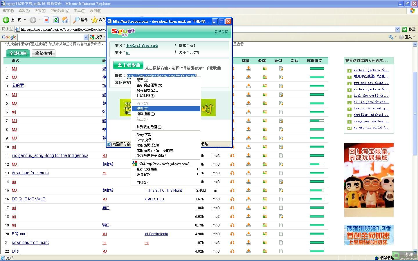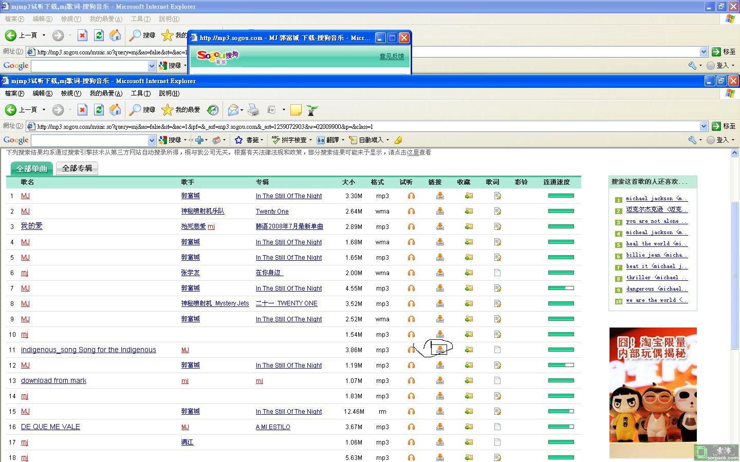 例如:可以在此網子選歌http://mp3.sogou.com/music.so?query=mj&as=false&st=&ac=1&pf=&_asf=mp3.sogou.com&_ast=1259072903&w=02009900&p=&class=1