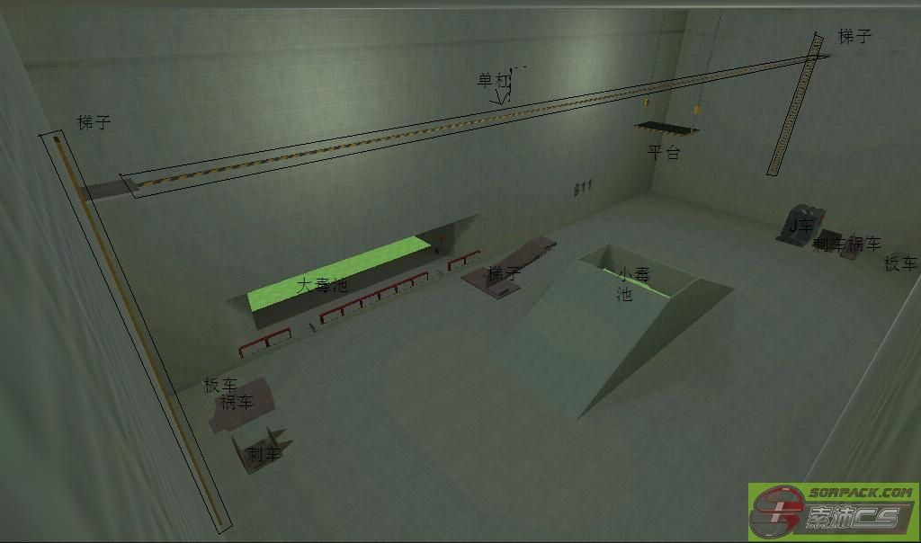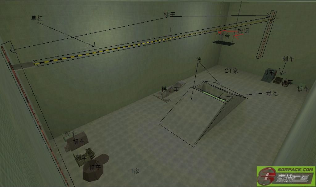 地图特点是对称,T、CT点各有两个。地图上有4辆普通车【可卡枪用,看9L】、4辆石头车,以及4个MP5的高台、4个O4的高台【旋转跳上去】。中间有一个房间,房间内重力较小,其他没什么。