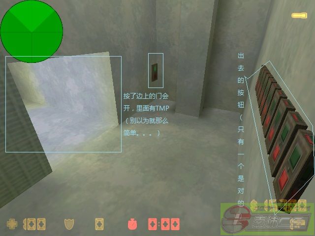 TIPS:常常有人已经坐传送板进去准备拿枪了,却掉入下面的水池里【别忘了跳上那个梯子】。好不容易上去了,却又不知道哪个门进去拿枪。在这里本想让大家慢慢试积累经验的,但于心不忍,还是告诉你们吧!上去以后,不用刻意向左或者向右转,因为最后看到的门的排列是一样的。看到有门以后,向后转,靠右边的那面墙上第三个就是进枪房的门。要出来,从第一扇门出,正后方的门就是了。