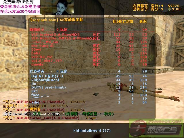 哈哈,抱歉了各位。今天战斗的时候发现居然5个Top.love战队的。神经过敏了,以为来抢服的呢。马上换上了我那只有4级的VIP账号跟大鲨鱼一同迎战。。 犯贱的在群里大叫一声。68服需要增援。。 IBM最先赶到,接着是teatea,正好换图,随即展开对战局势。T这边是我跟撒鲨鱼——IBM,teatea是后来的。。。还有:()跟帮我们的qiu123。。。 打着打着才发现对方那5位兄弟,不给力呀!战绩最高的才20:21 !!!