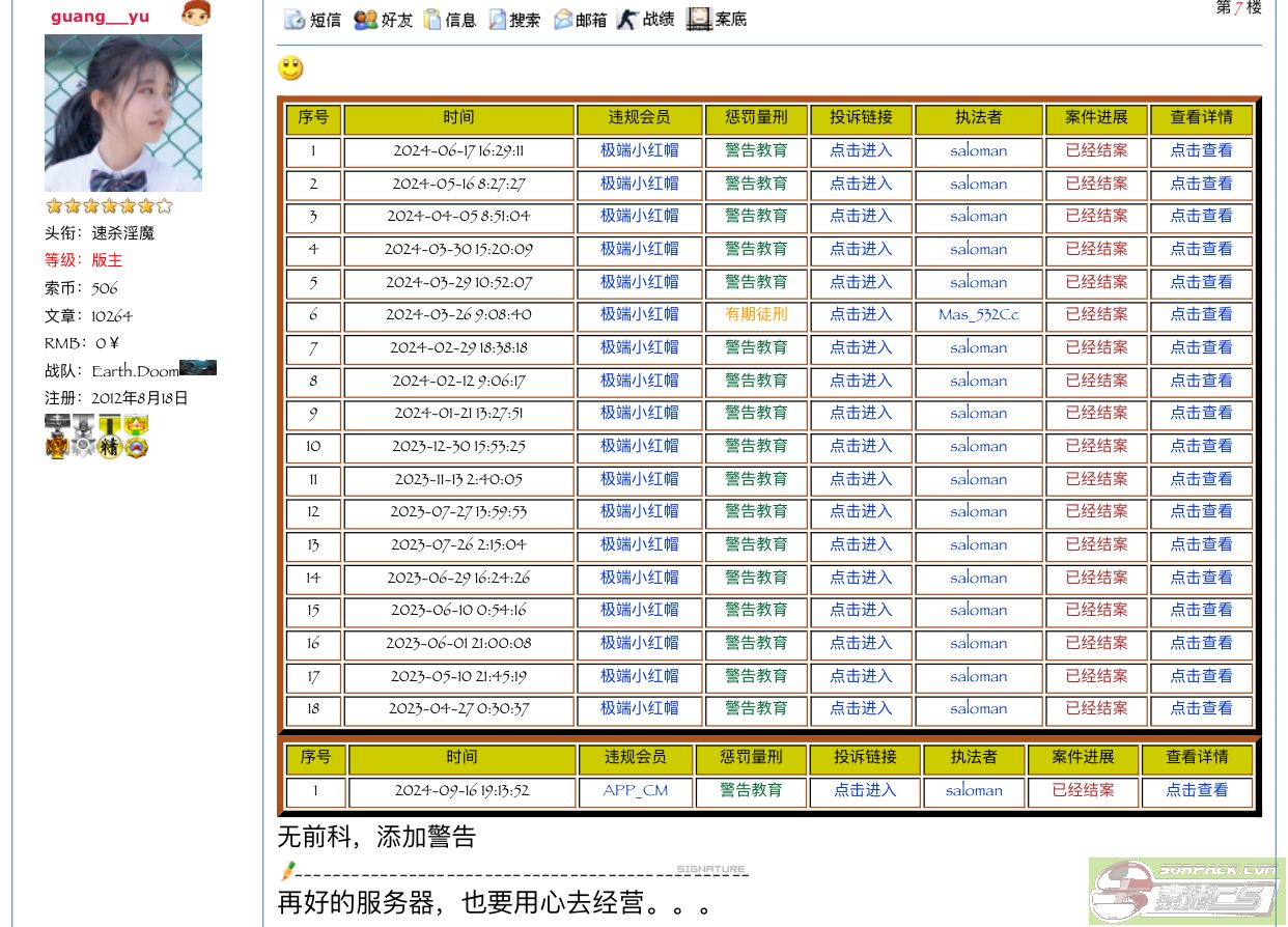 另外你的心里不要那么黑暗,从看到这个案件开始,里面任何玩家我都不认识。我判罚案件,不管对方是谁,就算是SP和超级版主,有违规我都照样封禁。