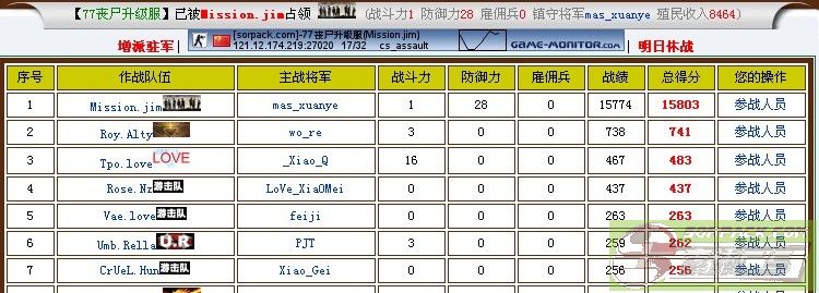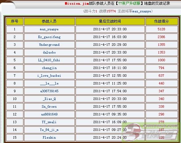 1.xuanye也就是小皇帝.当之无愧的战士,随然要上学,但一有时间就会守好自几的地盘.今天他彻底打动了我,很早和我约定,要打到5000分来巩固自几将军的位子,今天他做到了,可能有人会说,5000分还不简单吗.可是他是在只有两三个队员配合下.而且并不是打一天才有的战绩,所以特此提出表扬.